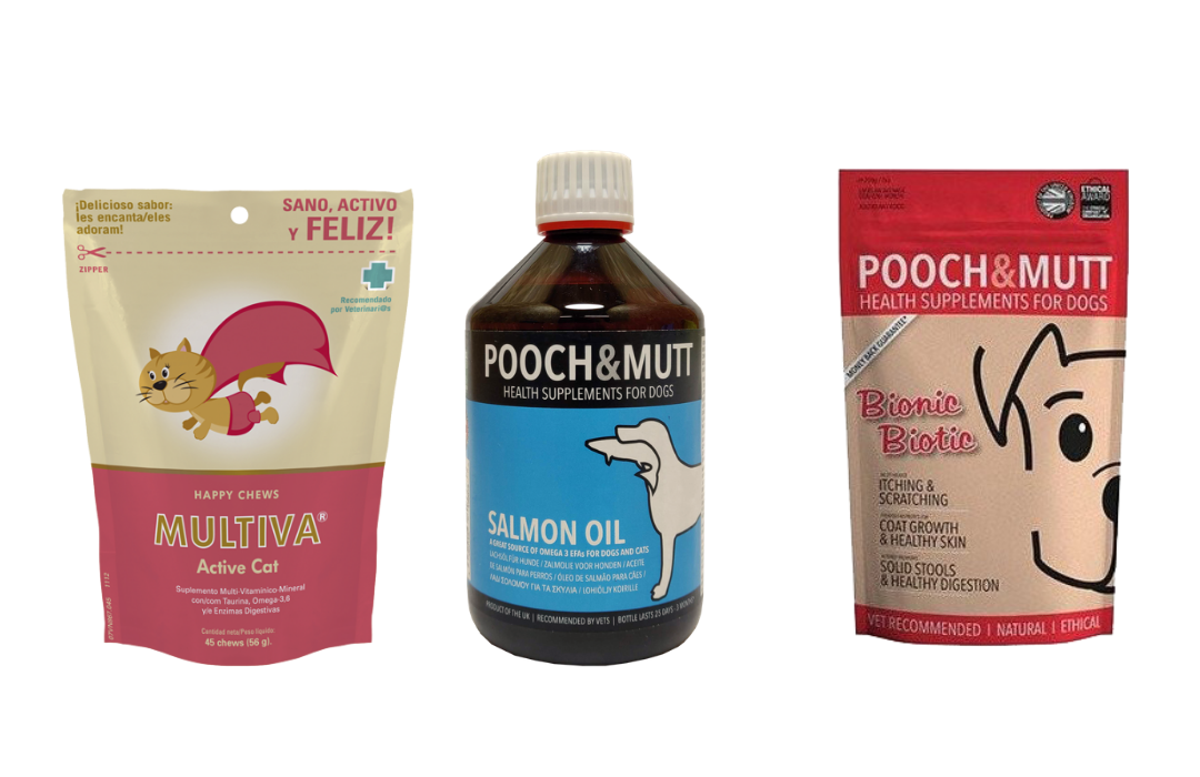 Para cães, o oleo de salmão da Pooh&Mutt é um suplemento natural para cães, rico em Ômegas 3, 6 e 9, e o bionic biotic é um bom suplemento alimentar para melhorar a pele e pelo, a digestão e reforço imunitário.