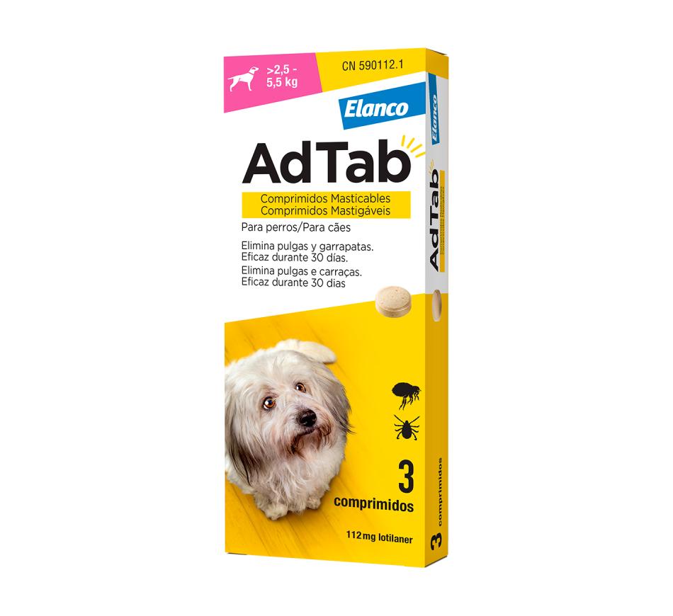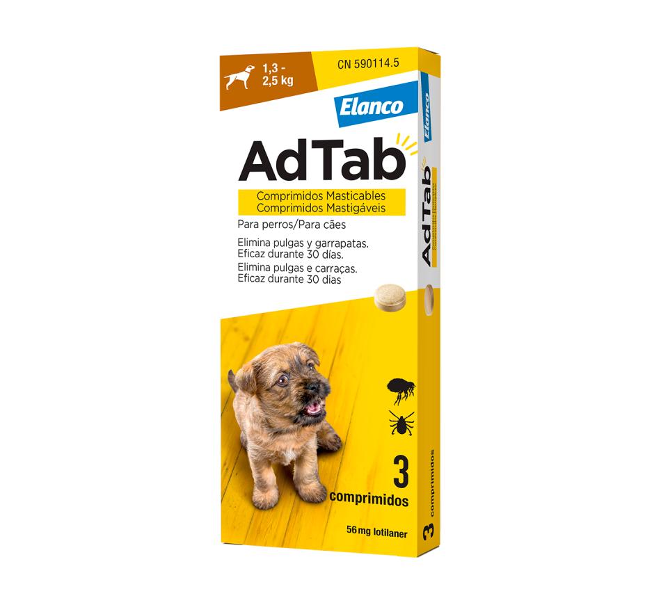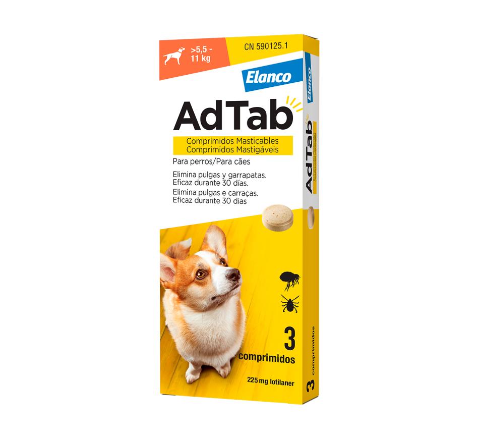 AdTab Chewable Tablets for Dogs from Elanco is a chewable tablet available in different sizes for dogs. With its delicious meat or vanilla flavor, its proven effectiveness in more than 70 different breeds and its immediate and persistent action, AdTab is the best option to protect your pets against fleas and ticks. Don't wait any longer to try it!