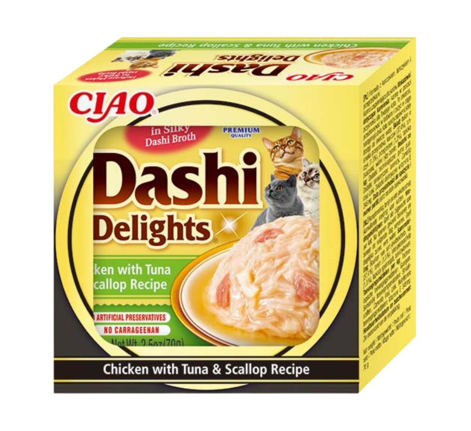 Pamper your feline friend with the irresistible flavor of Churu Gato Dashi Delights Chicken, Tuna and Scallop Recipe!