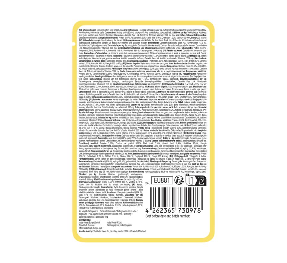 This delicious complementary food, containing succulent pieces of chicken immersed in a light and flavorful broth, provides your cat with a healthy and enjoyable snacking experience. It offers healthy, tasty, and grain-free nutrition. Cooked with fresh, high-quality ingredients. Contains vitamin E to support the immune system and green tea extract as a natural antioxidant.