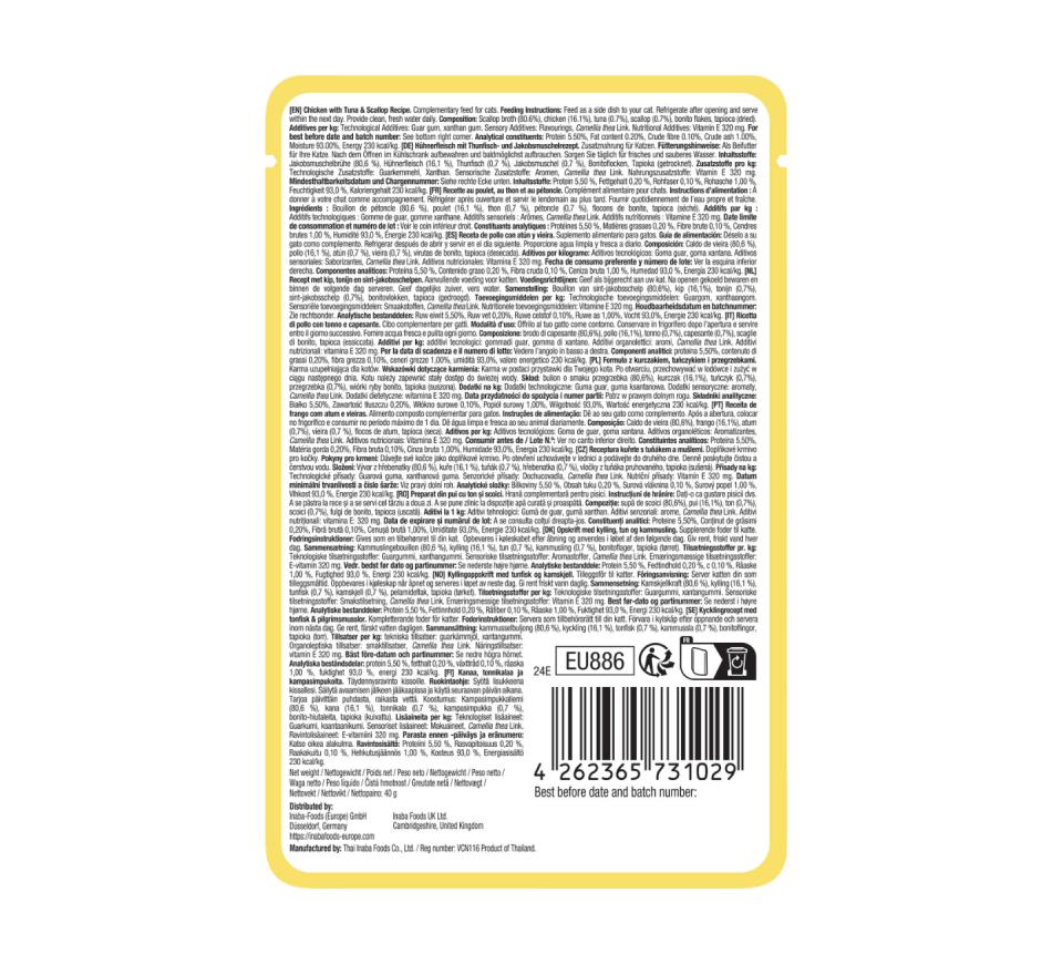 This delicious complementary food, containing succulent pieces of chicken, tuna, and scallops immersed in a light and flavorful broth, provides your cat with a healthy and enjoyable snacking experience. It offers healthy, tasty, and grain-free nutrition. Cooked with fresh, high-quality ingredients. Contains vitamin E to support the immune system and green tea extract as a natural antioxidant.