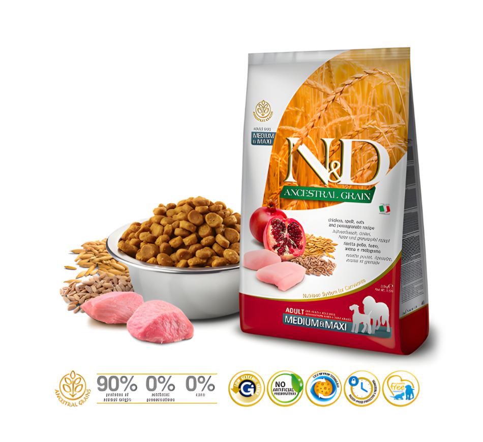 Give your best friend superior nutrition with Farmina N&D Ancestral Grain Adult Dog Medium & Maxi Chicken Food . This dry food is specially formulated to meet the nutritional needs of adult dogs of small breeds, ensuring a balanced and delicious diet that your pet will love!