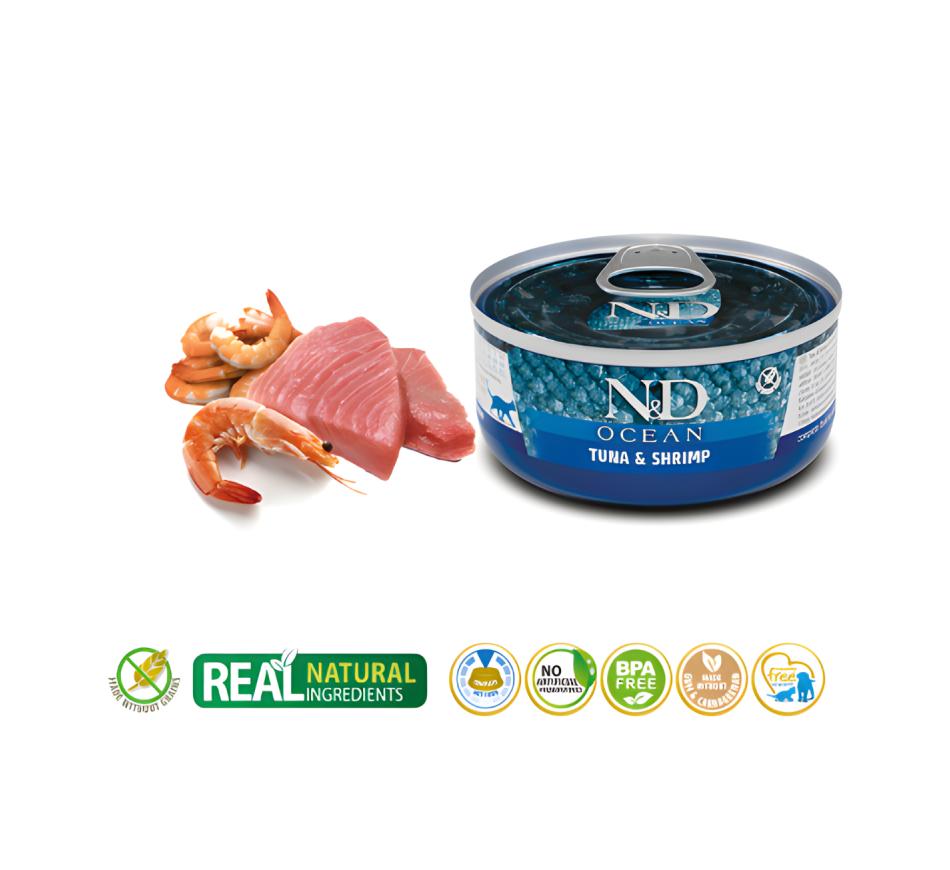 Farmina N&D Ocean Wet Cat Food - Tuna and Shrimp is a complete food ideal for adult cats with food sensitivities.