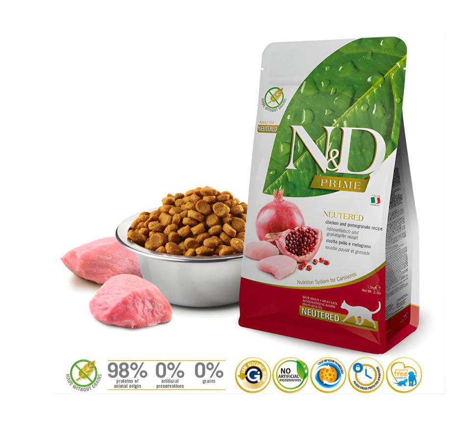 Discover the excellent nutrition your cat deserves with Farmina N&D Prime Neutered Sterilized Cat Food - Chicken . This dry food has been carefully formulated to meet the specific needs of sterilized adult cats, offering a complete and balanced diet that promotes health and well-being.