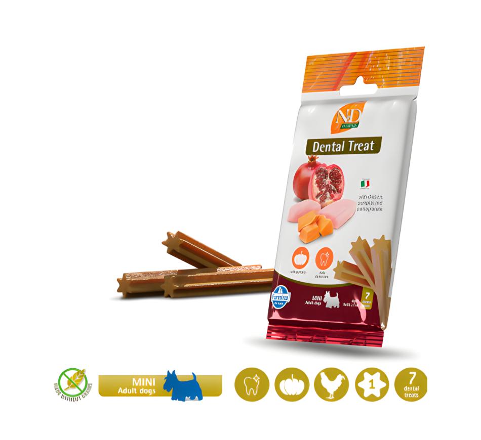 Farmina N&D Pumpkin Dental Treat Mini Dog Biscuits - Chicken are a delicious complementary food suitable for medium to large breed dogs over 4 months of age.