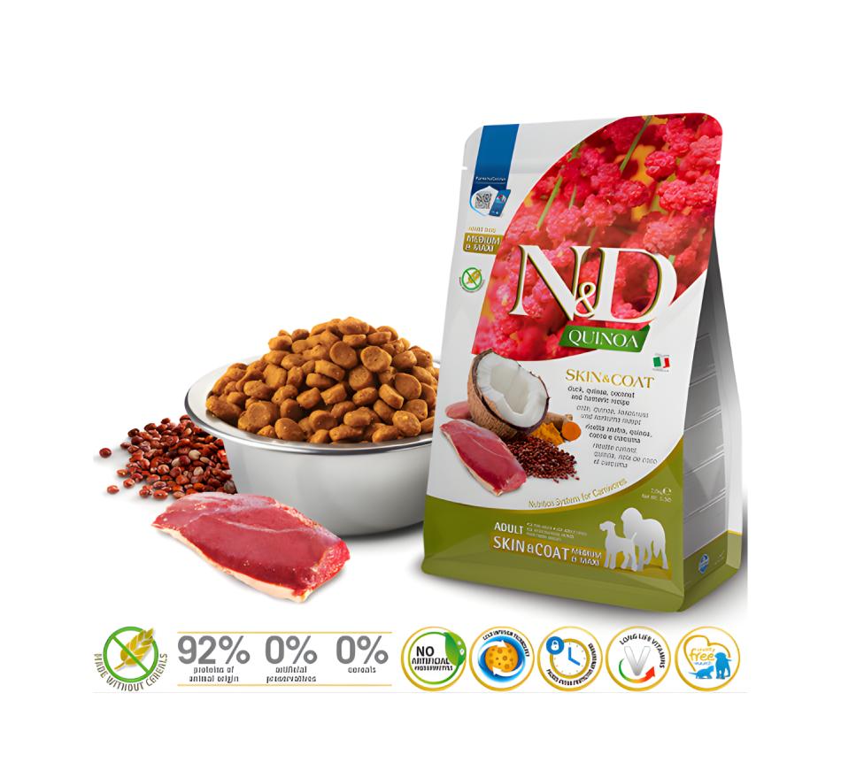 Give your dog exceptional nutrition with Farmina N&D Quinoa Skin Coat for Adult Dogs Medium & Maxi Duck , a complete dry food specially developed for adult dogs of medium and large breeds.