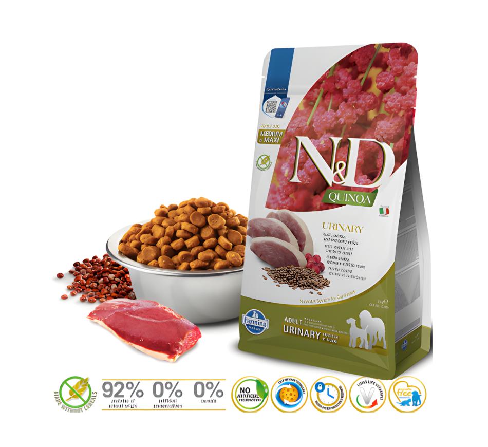 Farmina N&D Quinoa Urinary for Adult Dogs Medium & Maxi Duck Food is a complete dry food, carefully formulated to prevent the recurrence of struvite stones, ensuring your best friend stays healthy and happy.
