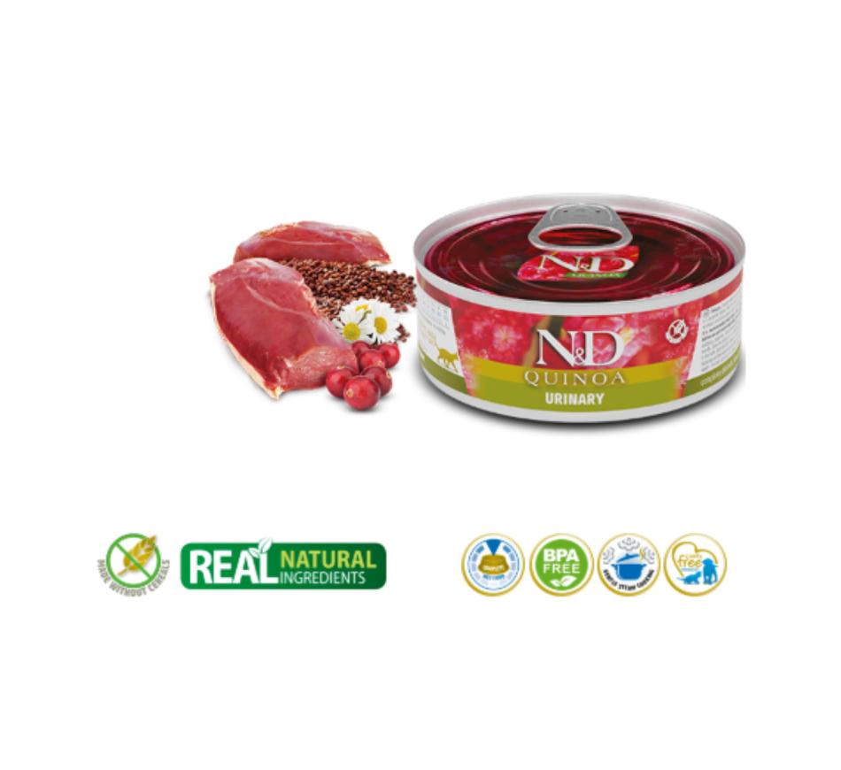Farmina N&D Quinoa Urinary Wet Cat - Duck wet food is a complete dietetic food, indicated for reducing the recurrence of struvite stones and diseases of the lower urinary tract.