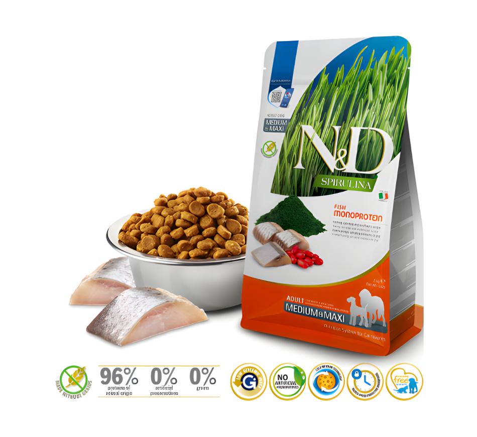 Discover the nutritional excellence your loyal companion deserves with Farmina N&D Spirulina for Dogs Medium & Maxi Fish Food . This dry food has been specially formulated to meet the needs of medium and large breed adult dogs, offering a unique and powerful combination of herring , spirulina , and goji berries.