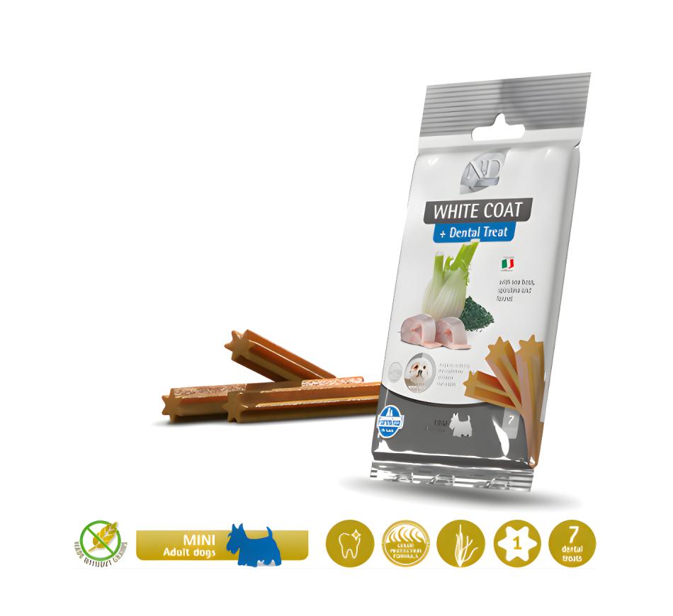 The delicious Farmina N&D White Coat Treat Mini - Sea Bass biscuits are a complementary food suitable for small breed dogs over 4 months of age.