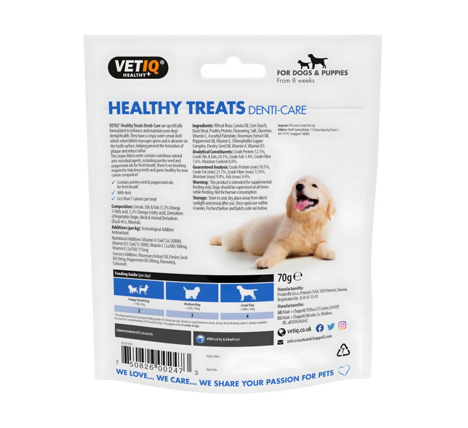 Healthy Treats Breath & Dental was formulated by animal nutritionists to promote the well-being of your pets. Each treat consists of a delicious crunchy snack with a creamy filling that improves your furry friend's oral health.