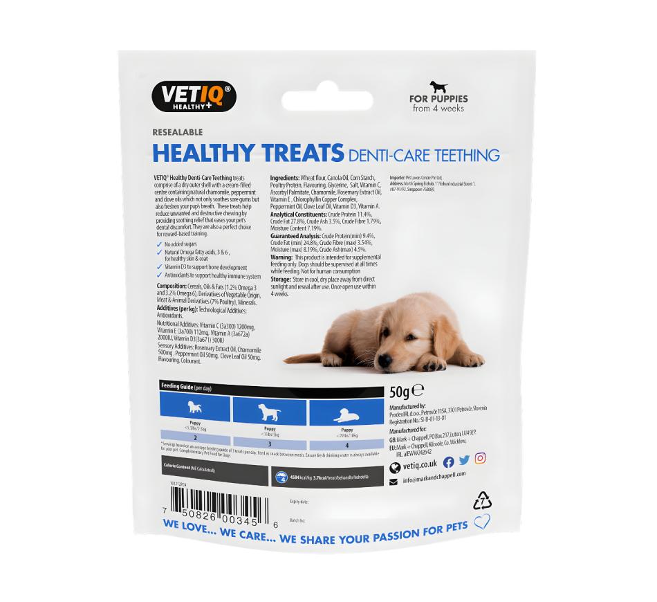Healthy Treats Teething for puppies are healthy snacks/treats developed to meet the specific dental needs of puppies.