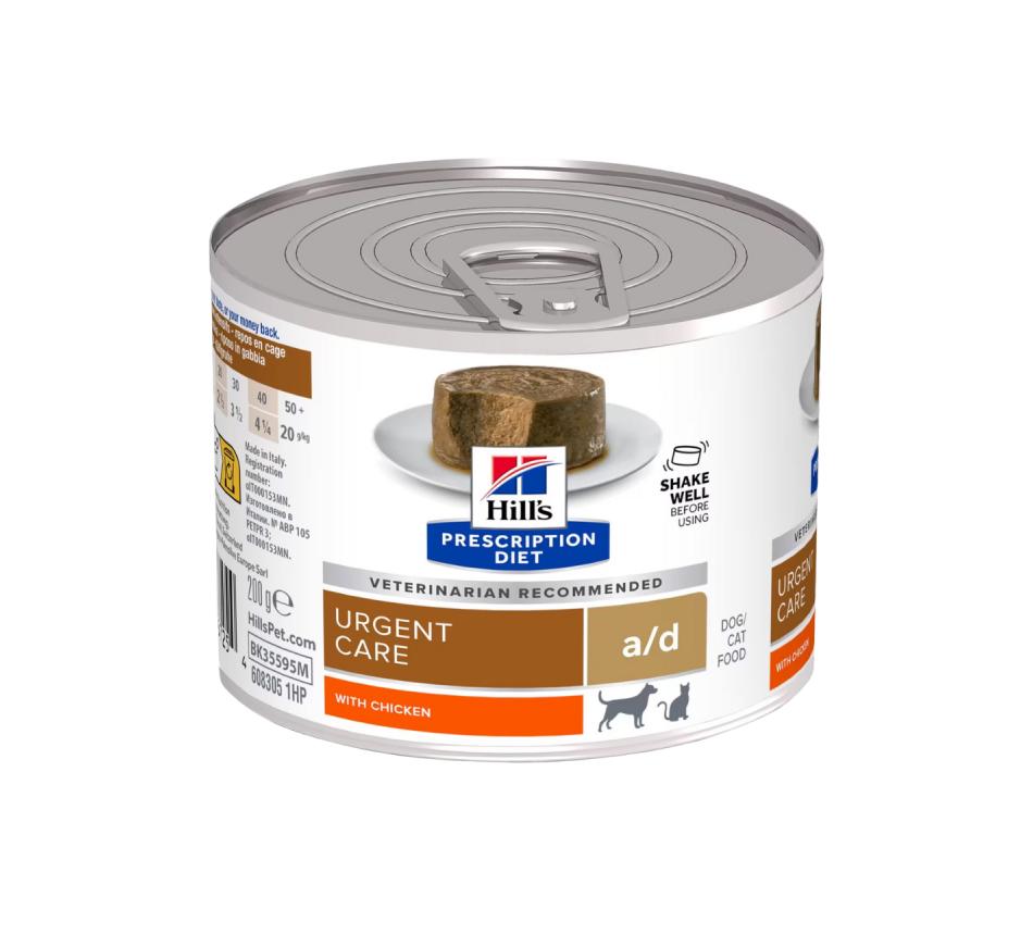 Hill's Prescription Diet Dog and Cat a/d Urgent Care chicken pate is a complete dietary food for dogs and cats for nutritional recovery (convalescence) and feline hepatic lipidosis. This food contains a high energy content, a strong concentration of essential nutrients and high nutrient digestibility.