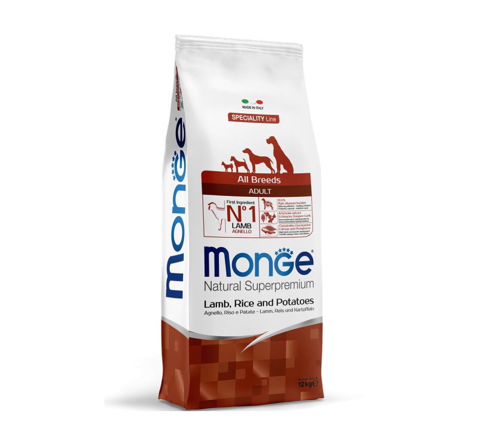 Monge Natural Superpremium Specialty Line Adult with Lamb, Rice and Potatoes is a complete, balanced and monoprotein food, only lamb protein, indicated for all breeds of adult dogs that need highly digestible food. This food guarantees the well-being of your animal, thanks to the high quality of nutrients. Highly palatable products with a single protein guarantee: just one type of meat. With Lamb as its main ingredient, it is also enriched with XOS (Xylo-oligosaccharides), the latest generation of prebiotics that maintain intestinal well-being.