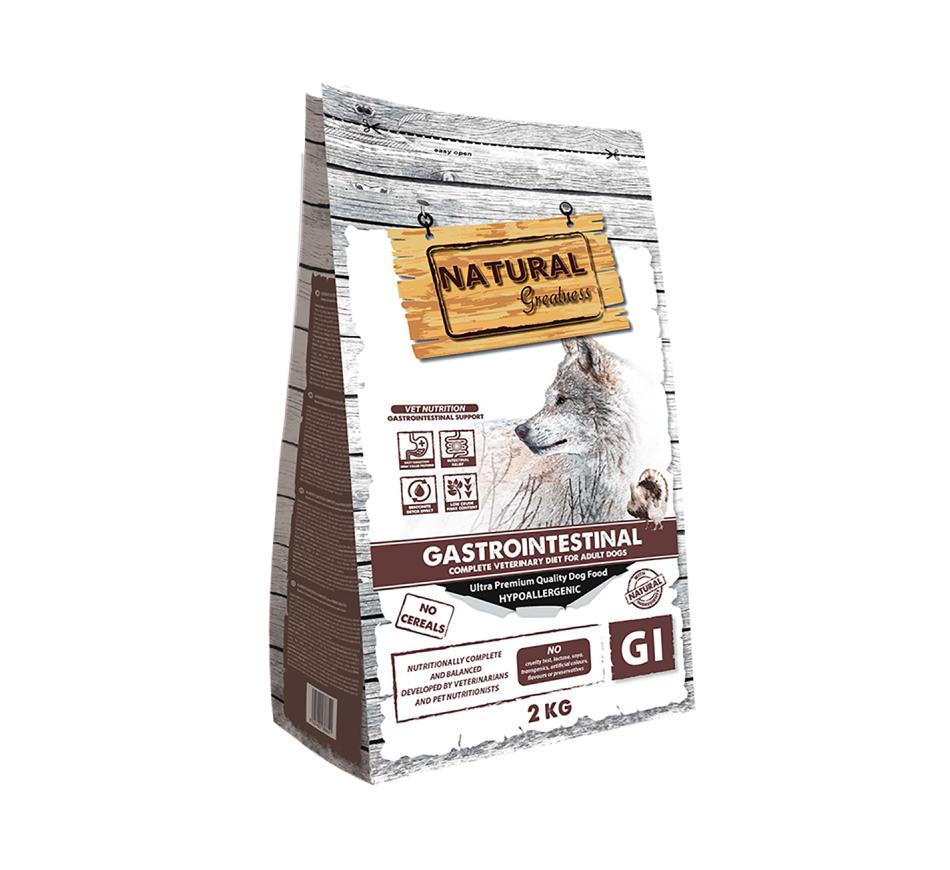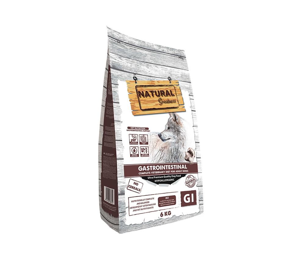 Natural Greatness Gastrointestinal is a complete hypoallergenic cereal-free recipe. Food intended for adult dogs of all breeds with intestinal absorption disorders.