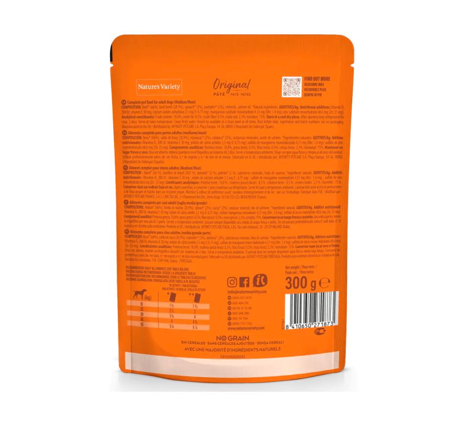 Complete food, in pate, balanced for adult dogs, without cereals. With top quality beef as the main ingredient, and with fruits and vegetables.