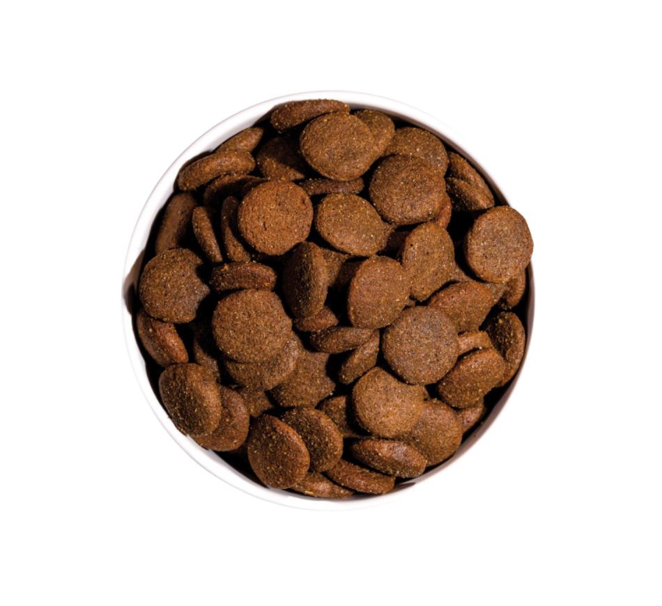 Complete food in kibble form for adult dogs of large and giant breeds, with 30% fresh chicken and turkey. The larger kibbles encourage chewing and make them eat more slowly.