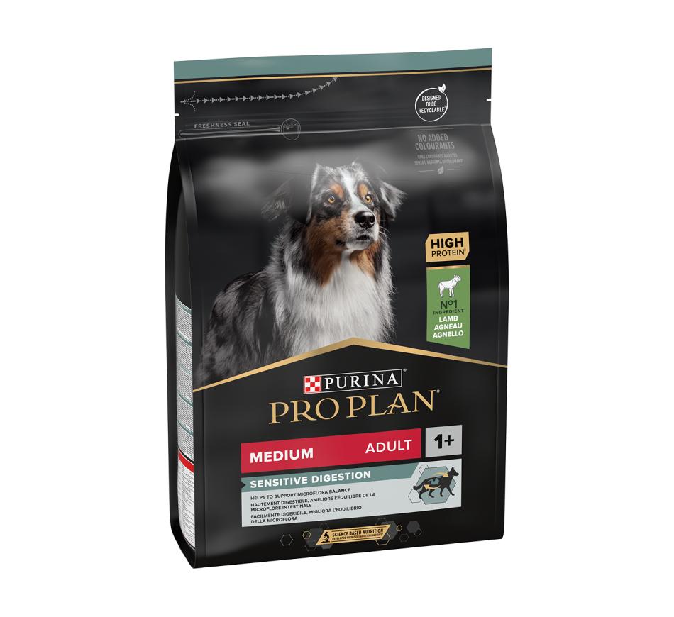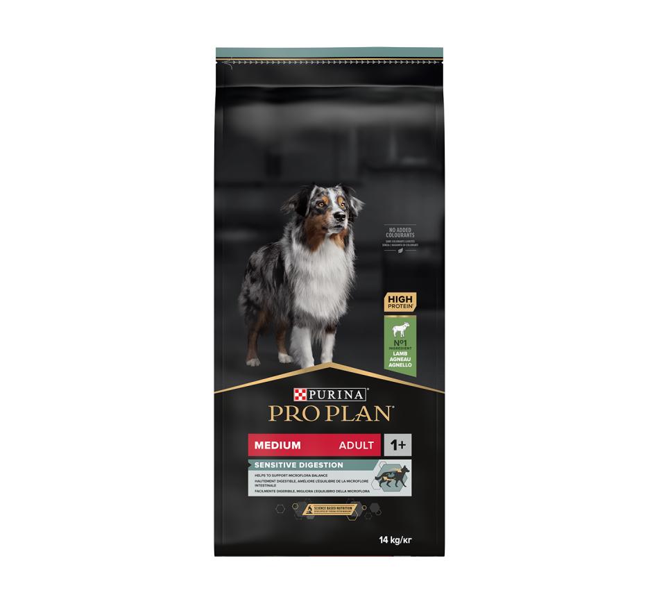Purina Pro Plan Medium Adult Dog with OPTIDIGEST®, a balance of nutrients at specific levels for medium-sized Adult dogs with sensitive digestion.
