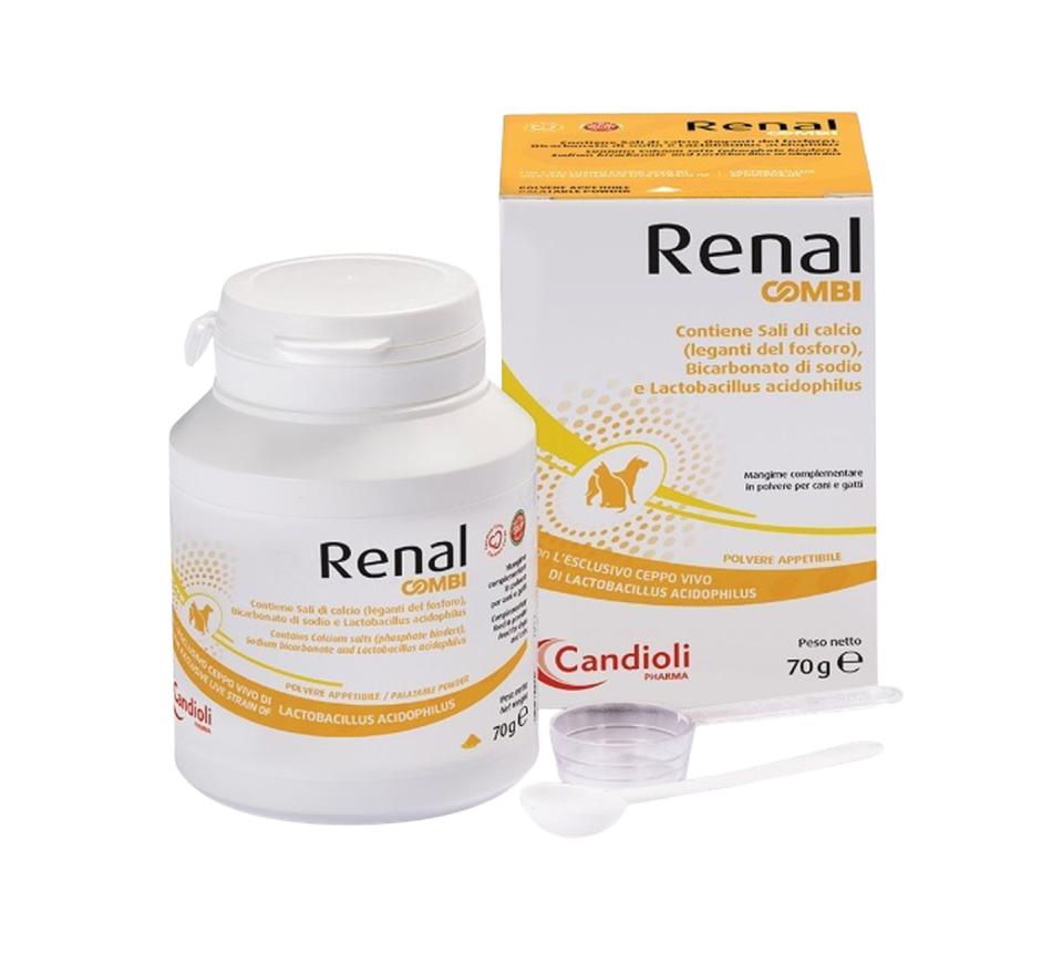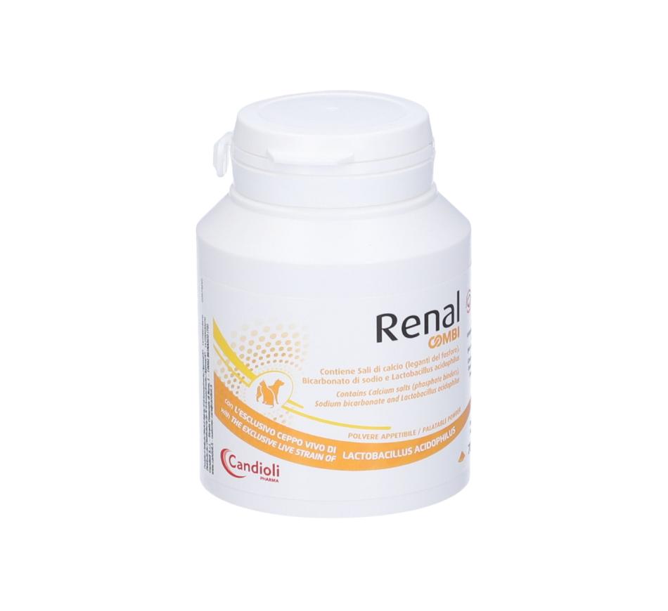 Renal COMBI provides calcium carbonate, calcium lactate gluconate, chitosan, sodium bicarbonate, fructooligosaccharides, olive oil polyphenols, Lactobacillus acidophilus, and vitamins that promote antioxidant defense and normal kidney function.