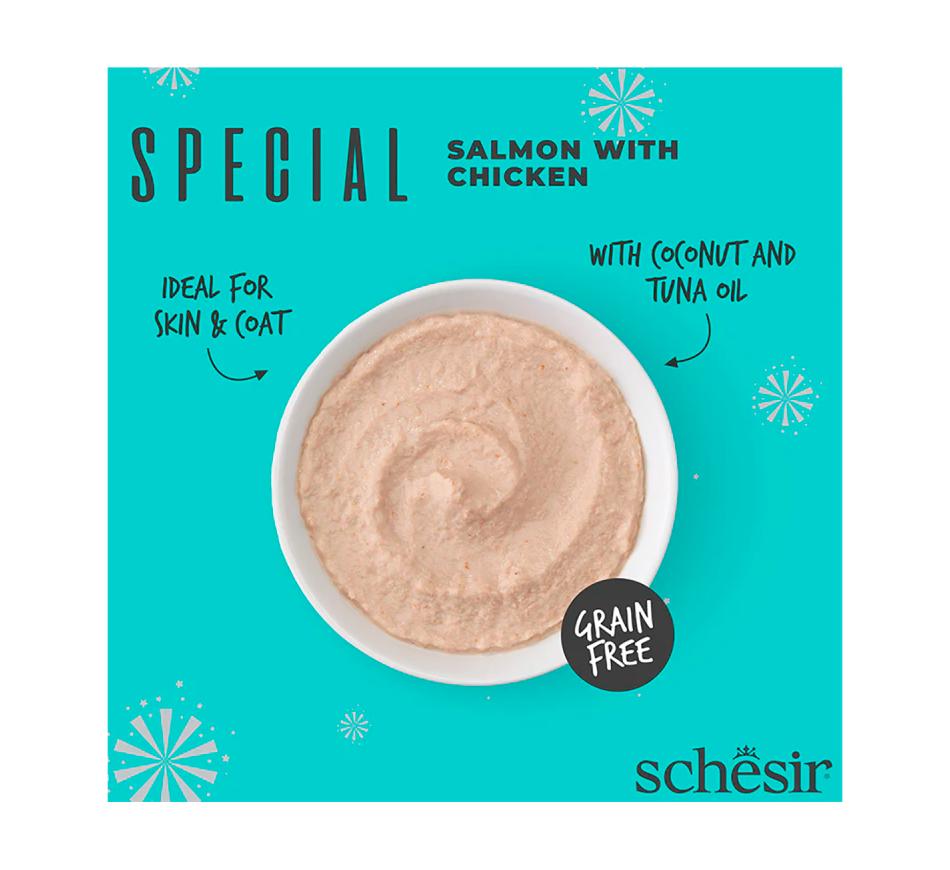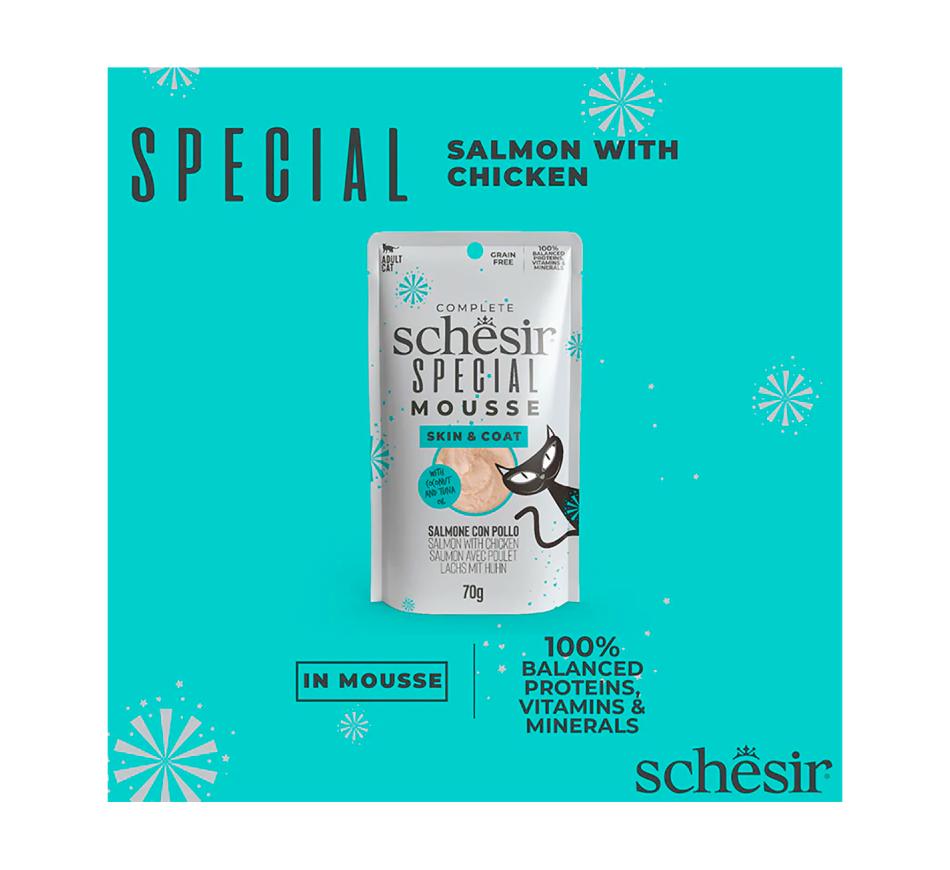 Recipe specifically formulated to support the well-being of fur and skin, based on salmon and chicken enriched with coconut oil and tuna oil, mixed into a soft mousse.