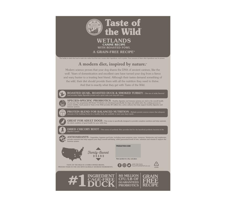 Taste of the Wild Wetlands, with 32% protein, is packed with highly digestible and energy-dense duck, quail and turkey, along with nutrients sourced from packaged vegetables, legumes and fruits. Ingredients carefully selected to provide easy-to-digest protein and essential fatty acids to help promote overall health.