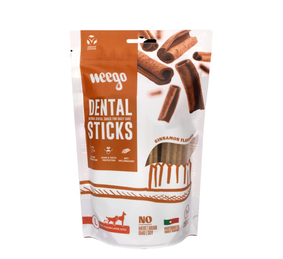 Weego® Dental Sticks is a vegan, grain-free complementary food for dogs with a cinnamon flavor.