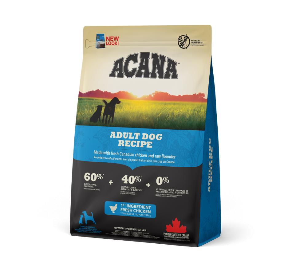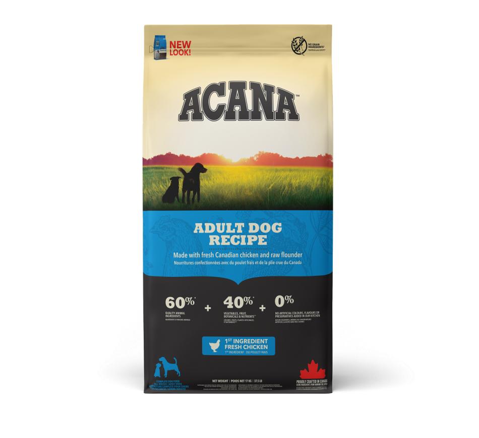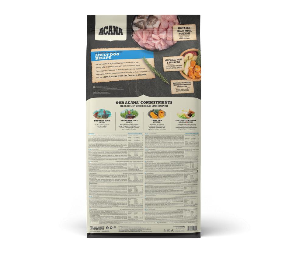 Acana Adult Dog Recipe está repleto de ingredientes locales frescos, que incluyen pollo de corral, huevos de corral, halibut salvaje y frutas y verduras maduradas al sol.