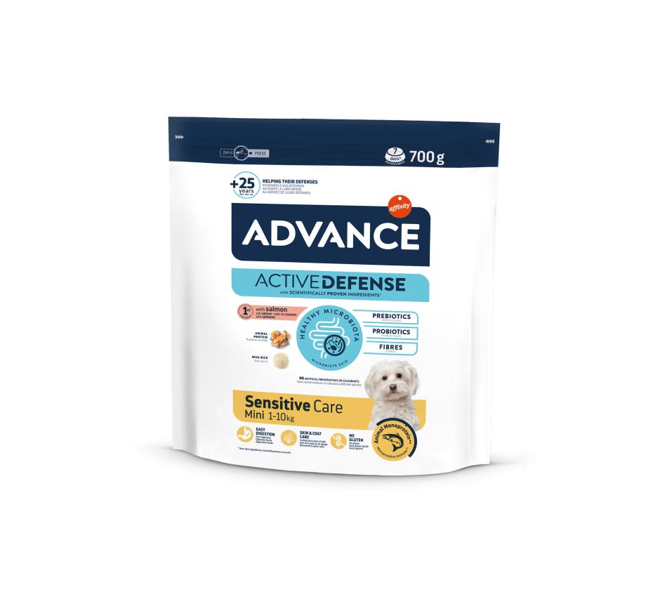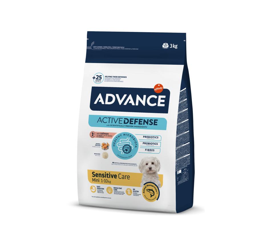 Advance Adult Mini Sensitive es un alimento de alta gama especialmente indicado para perros adultos de razas pequeñas (menos de 10 kg de peso) con intolerancia a la proteína de la carne y otros ingredientes frecuentemente asociados a la sensibilidad digestiva: