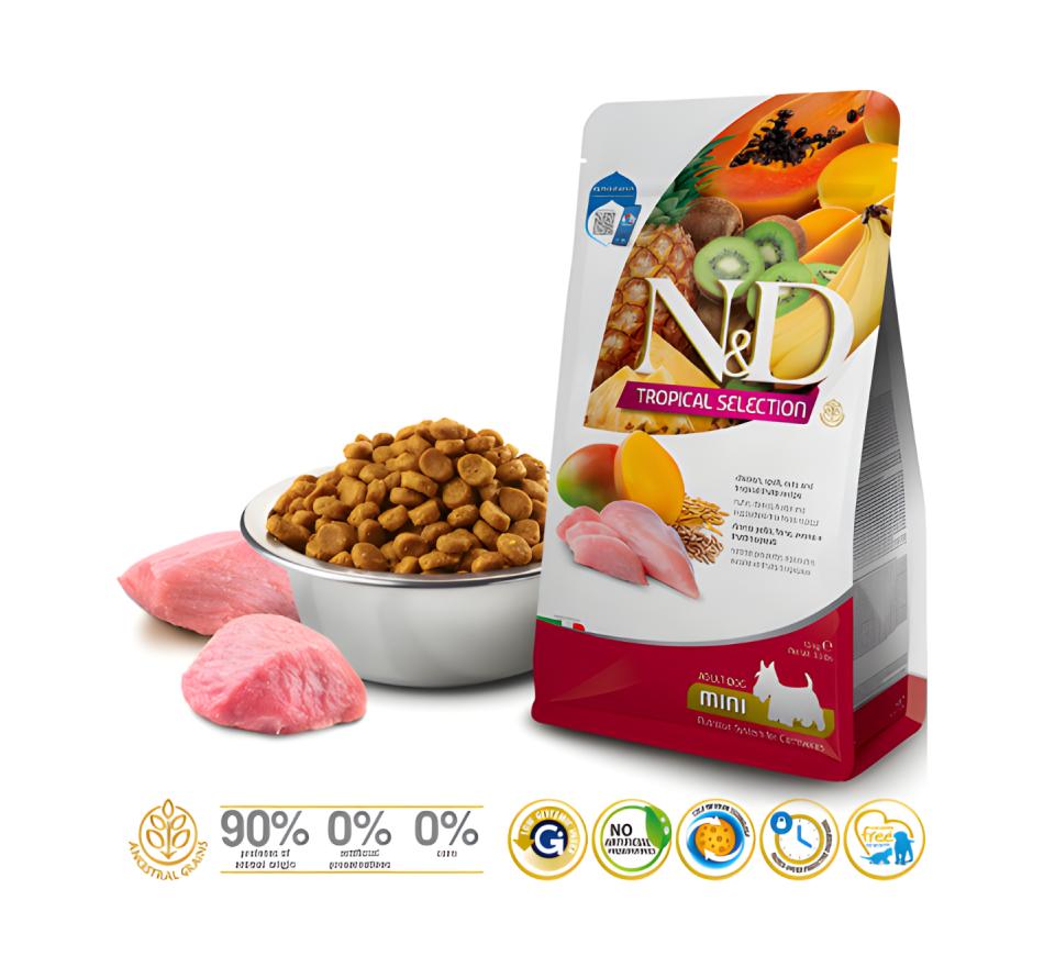 Dale a tu mejor amigo una nutrición superior con el alimento para perros Farmina N&D Tropical Selection Adult Mini con pollo. Este alimento seco completo está especialmente formulado para satisfacer las necesidades de perros adultos de razas pequeñas y mini, brindándoles una alimentación deliciosa y equilibrada.