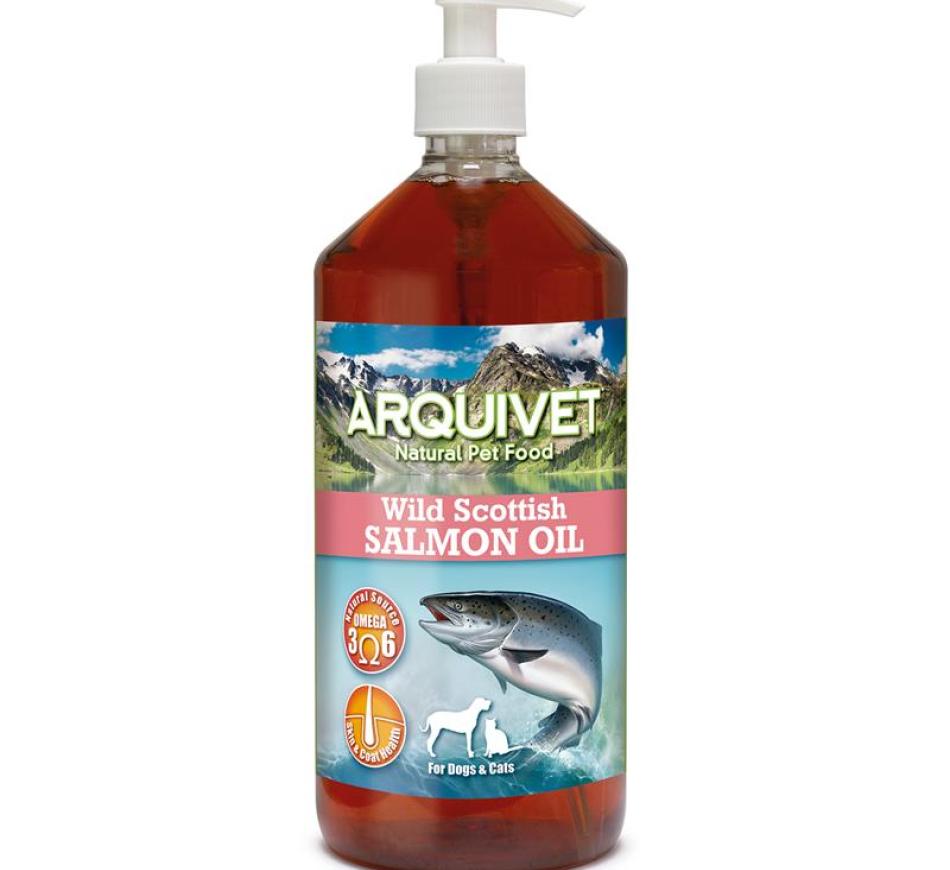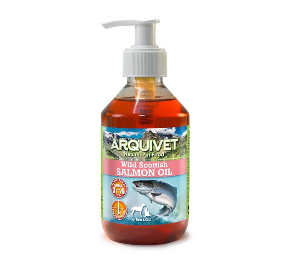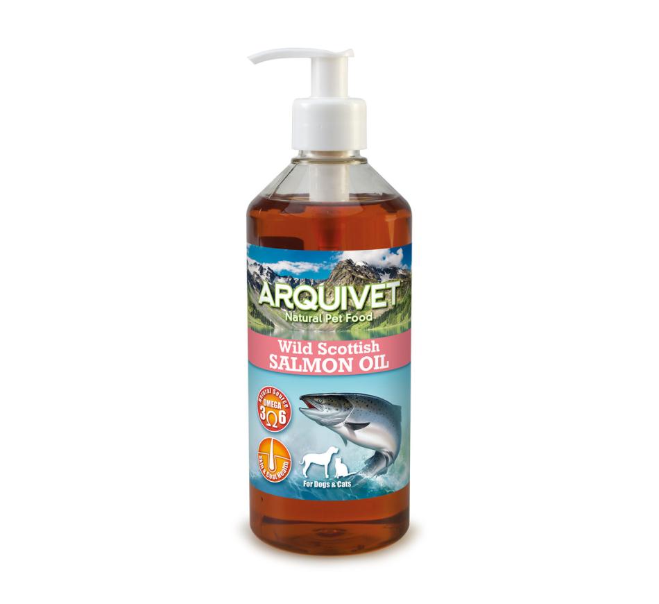 Aceite de Salmón Natural Escocés 100%, prensado en frío, rico en ácidos grasos omega-3 y omega-6, mejora el estado de la piel y pelaje, sistema inmunológico e inflamatorio, mejora la digestión, y es apto para perros y gatos.