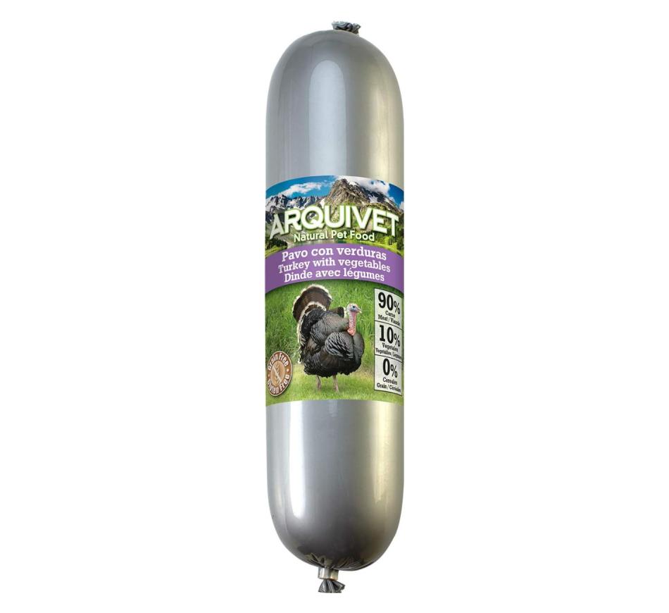 Comida húmeda, en forma de embutido, con un 90% de carne, sin cereales y sin gluten. Con pavo y verduras, es apto para todos los perros a partir de 3 meses de todas las razas y todos los tamaños.
