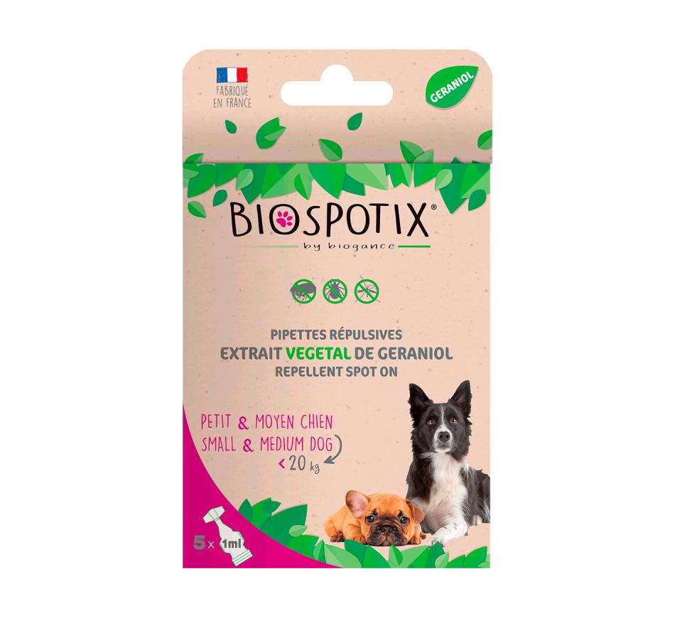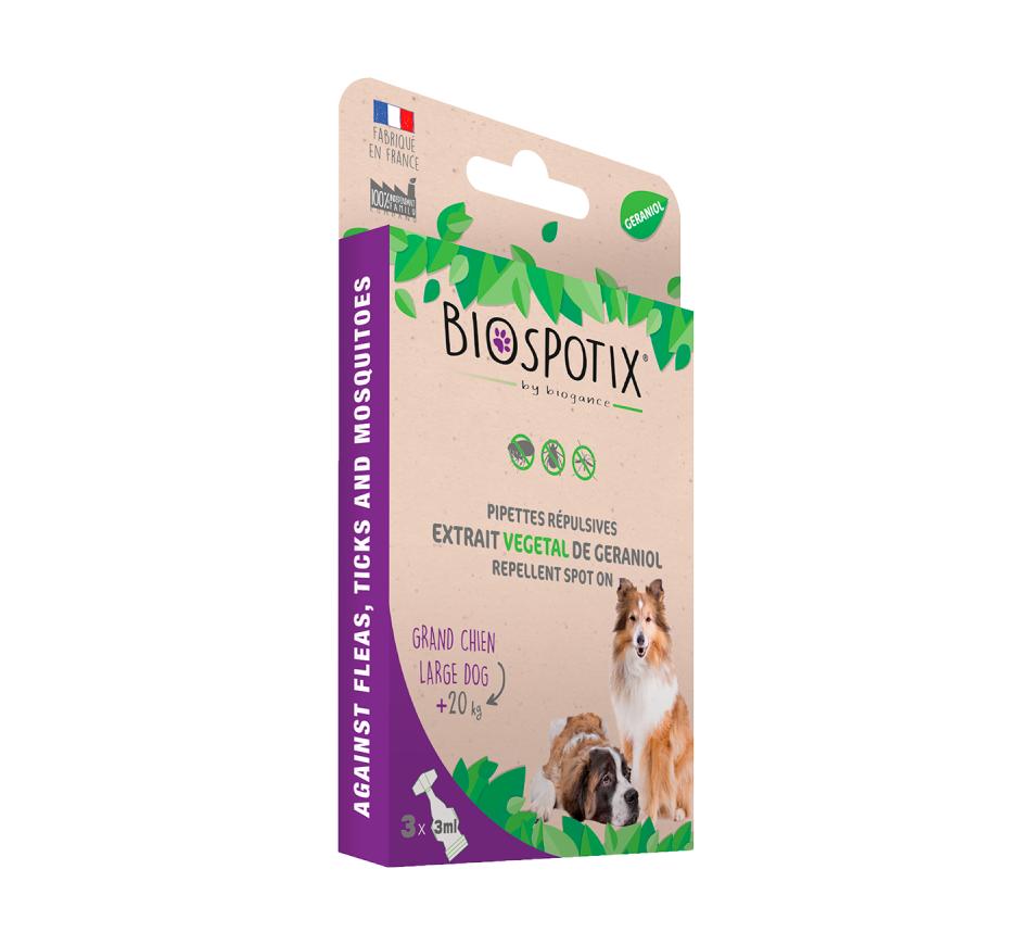 Biospotix spot on es una solución 100% natural que protege eficazmente a tu perro de parásitos, pulgas, garrapatas y piojos, utilizando aceite de geraniol natural.