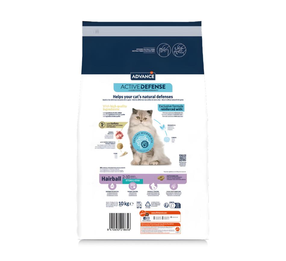 Advance Cat Sterilized Hairball ayuda a controlar el peso en gatos esterilizados, reduce el riesgo de problemas urinarios, y gracias a la fibra de avena y extracto de malta ayuda a prevenir la formación de bolas de pelo, todo en un solo pienso.