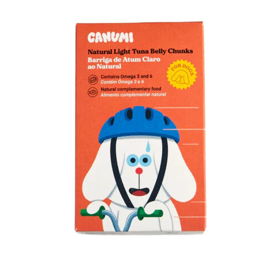 Canuni lata de atún claro al natural, envuelto en un delicioso y nutritivo caldo de pescado procedente del agua de cocción. Sin sal añadida, es seleccionado a mano en un proceso artesanal, de calidad para el consumo humano y con todos los beneficios funcionales de esta parte riquísima del atún, adaptado a la naturaleza biológica del perro.