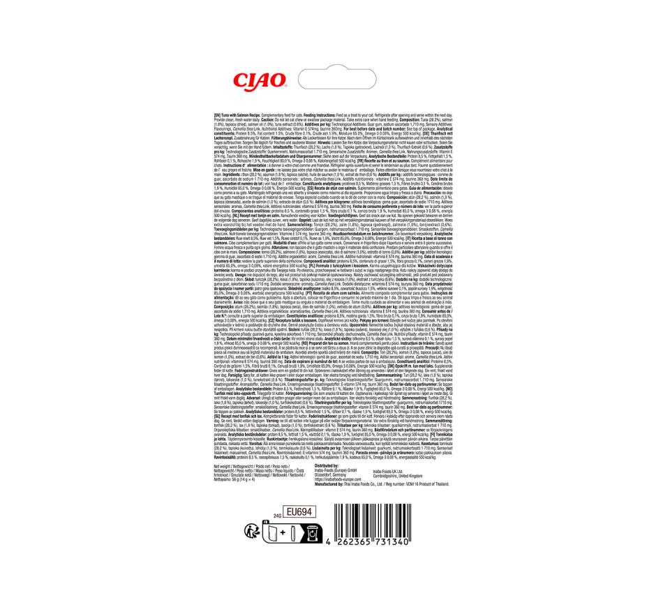 La Churu Gato Senior Receta de atún y salmón es un snack funcional, cremoso y natural, especialmente desarrollado para satisfacer las necesidades de gatos mayores de 10 años. Con atún 100 % natural , este premio no solo deleita el paladar de tu gato, sino que también favorece una digestión saludable, la salud cardiovascular y la hidratación.