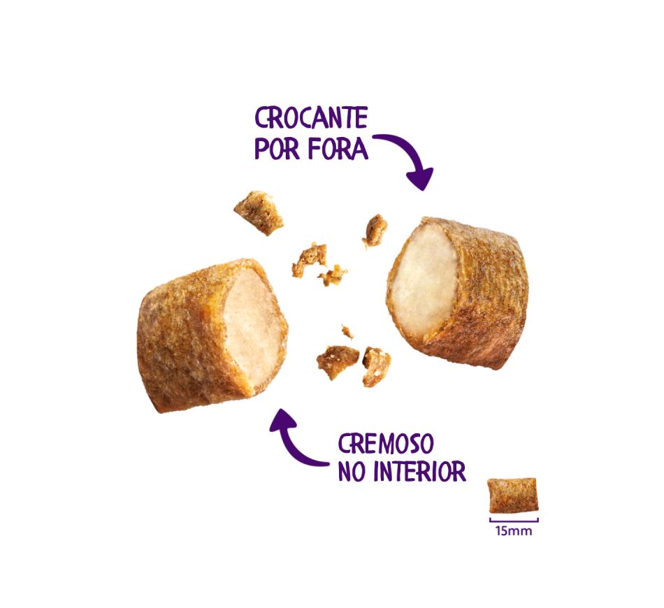 Con una corteza crujiente y un centro suave y cremoso, estas golosinas ofrecen una textura sorprendente que tu gato no podrá resistir. Están repletas de pollo fresco y sabroso e ingredientes naturales, sin cereales ni azúcares añadidos. Y con menos de 2 kcal por golosina.