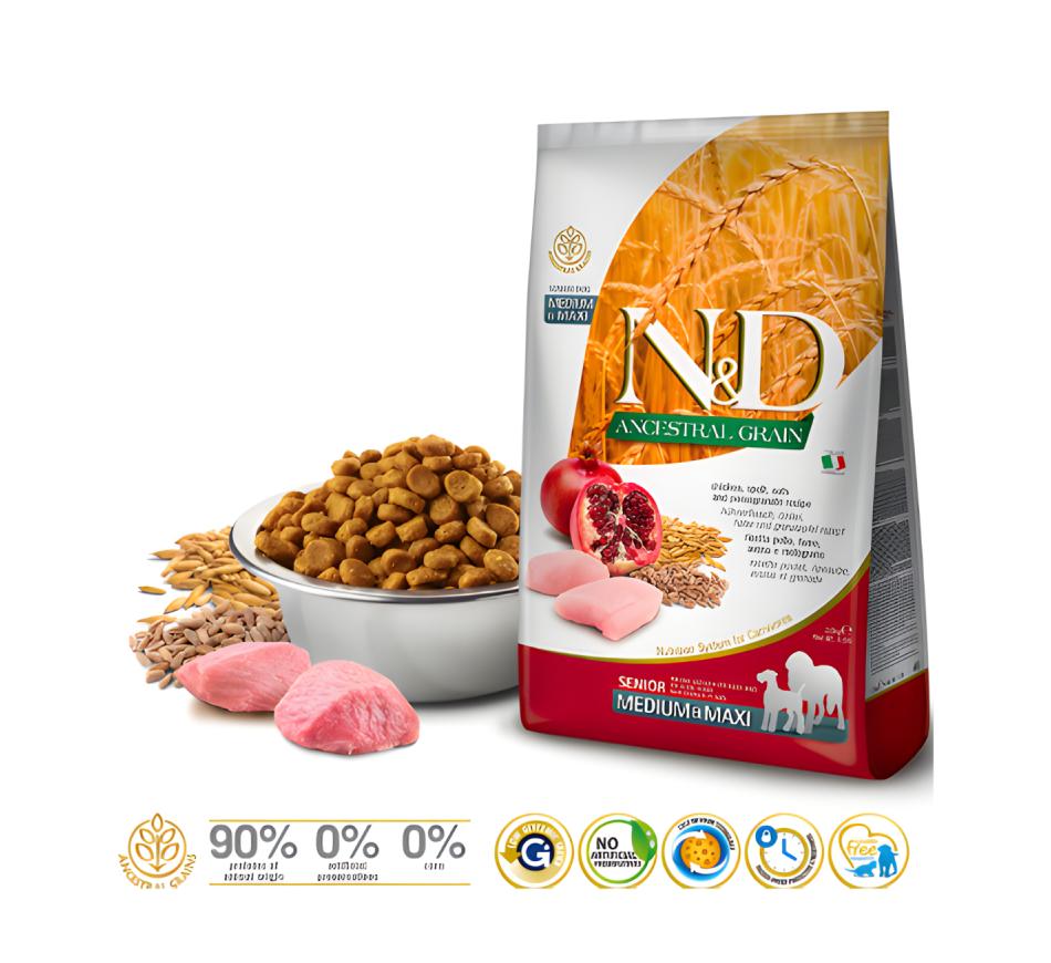 Ofrécele a tu perro mayor lo mejor en nutrición con Farmina N&D Ancestral Grain para perros Senior mediano y maxi.