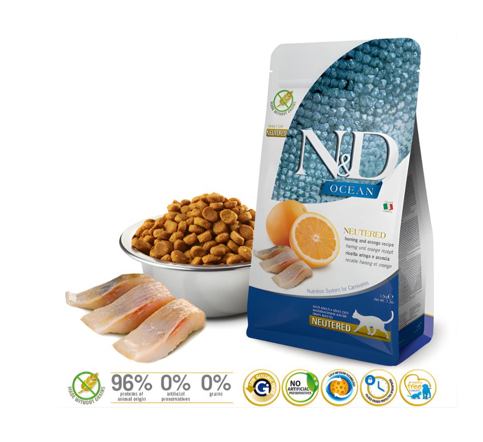 Dale a tu gato la nutrición premium que se merece con Farmina N&D Ocean Neutered Sterilized Cat Food - Herring . Este alimento seco completo está especialmente formulado para gatos adultos esterilizados y ofrece una dieta equilibrada y sabrosa.