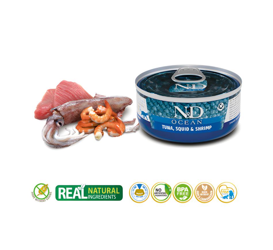 Farmina N&D Ocean Wet Cat Food - Tuna, Squid and Shrimp es un alimento completo ideal para gatos adultos con sensibilidades alimentarias.