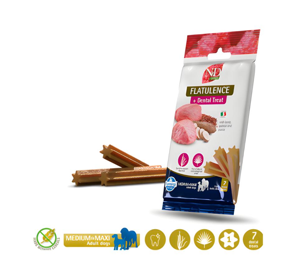 Las galletas para perros Farmina N&D Quinoa Flatulence Treat Medium & Maxi son un delicioso alimento complementario para perros de razas medianas a grandes mayores de 4 meses de edad.
