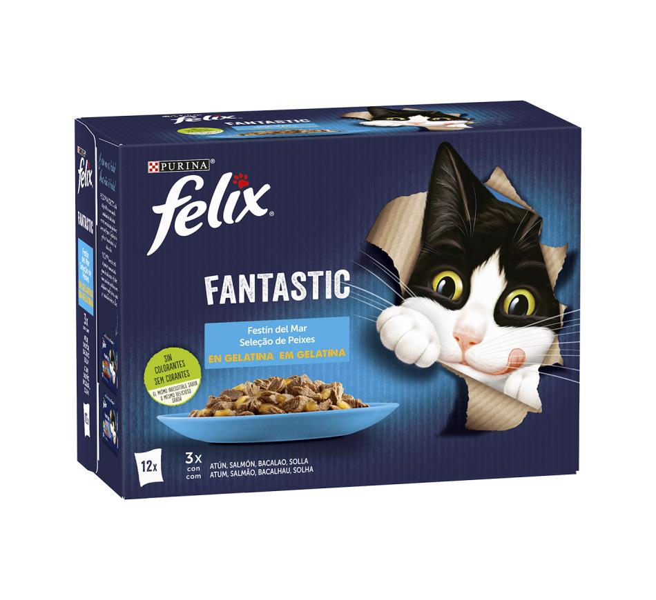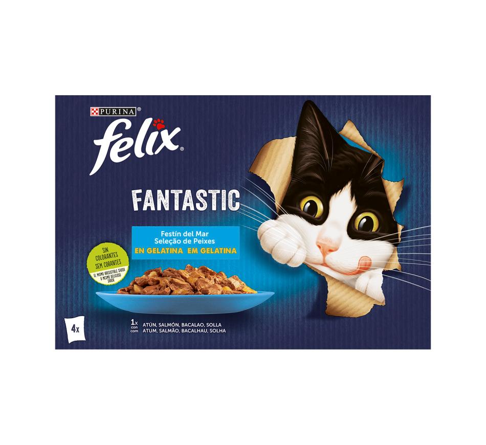 Felix Fantastic Seafood Feast in Jelly es un alimento húmedo en trozos para gatos adultos, con varios sabores de pescado, atún, bacalao, lenguado y salmón en una suculenta gelatina.