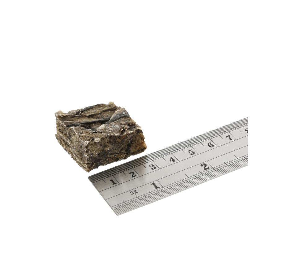 Cuadrados de pescado con cecina de mar dental Los cuadrados de pescado con cecina de mar miden 30 mm de largo por 30 mm de ancho y 15 mm de profundidad (el tamaño puede variar ligeramente).