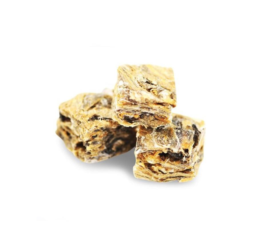 - Elaborado con piel de pescado 100% seca (horneado a la perfección)