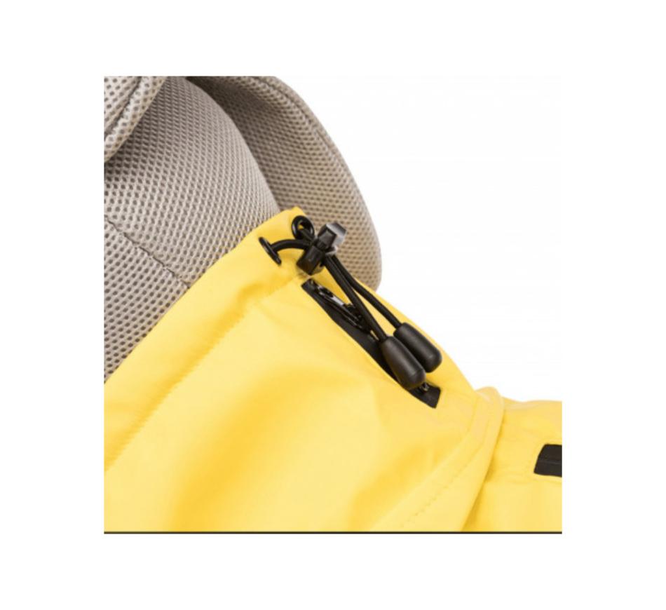 Chubasquero Vimy amarillo para perros. Con dos cremalleras impermeables, en la zona del cuello para fijar correa y en la espalda para uso con arnés. Cuello extra alto con ajuste en el cuello.
