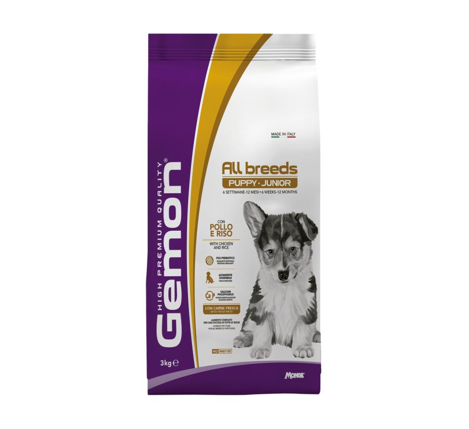 Gemon Cão All Breeds Puppy & Junior Chicken and Rice es un alimento completo para perros de todos los tamaños. Su fórmula contiene ingredientes de alta calidad como pollo, fuente de nutrientes esenciales, y arroz, fuente de carbohidratos. La receta es altamente digestible gracias al proceso de extrusión. Una dieta equilibrada con prebióticos, como fructooligosacáridos (FOS), y pulpa de remolacha, fuente de fibra insoluble, que favorece la función intestinal.