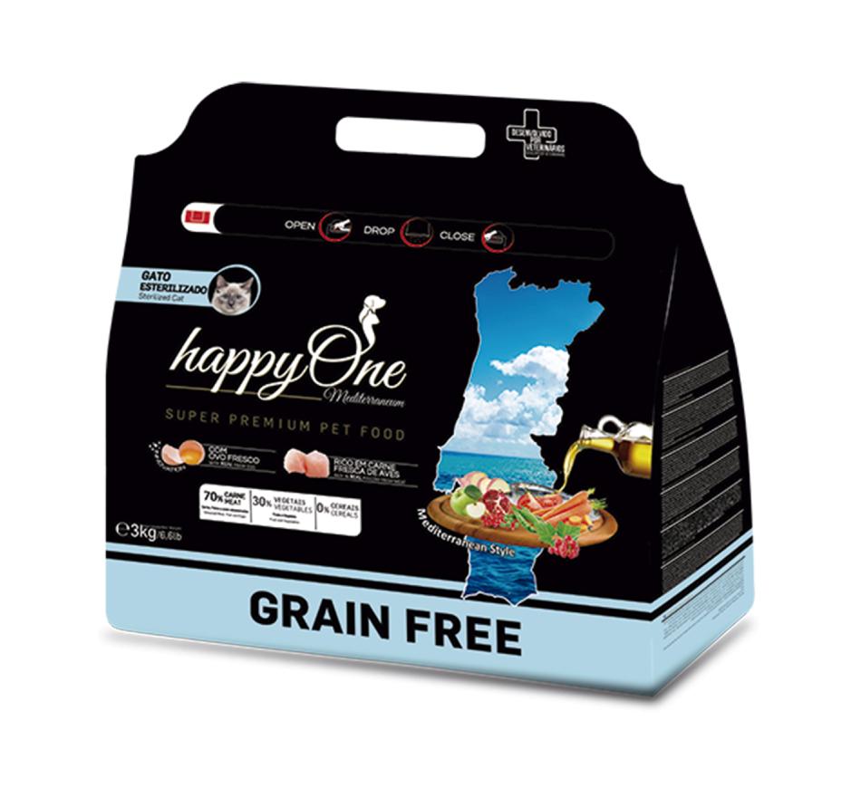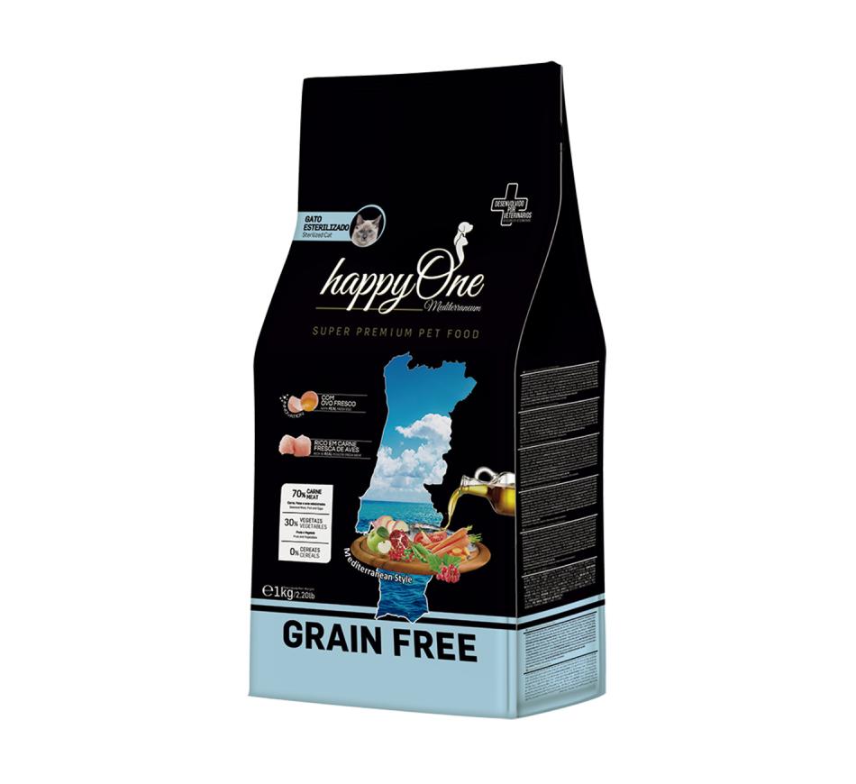 HappyOne Mediterraneum Sterilized Adult Cat es un pienso super premium, sin cereales, con ingredientes de calidad, un pienso que permite una mayor digestibilidad, con antioxidantes naturales.