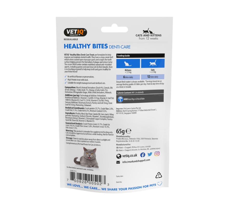 Bocados saludables para el aliento y la salud dental de gatos y gatitos Healthy Bites Breath & Dental son deliciosas golosinas de doble acción formuladas con una capa exterior seca que masajea las encías y raspa la superficie del diente, y un relleno interior cremoso para mejorar la salud bucal, que contiene ingredientes naturales antibacterianos, antimicrobianos y refrescantes del aliento.