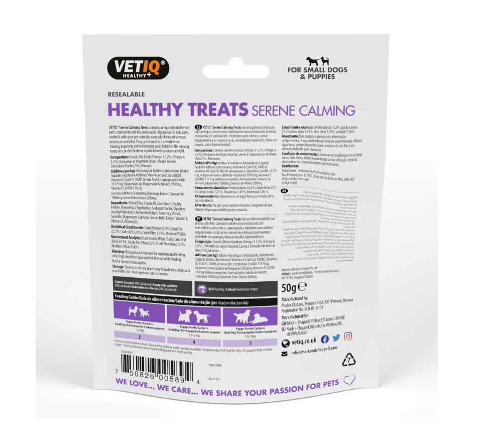 Este delicioso y relajante snack contiene una selección única de hierbas como la melisa, la manzanilla y el L-triptófano que calman y relajan a tu mascota de forma natural.