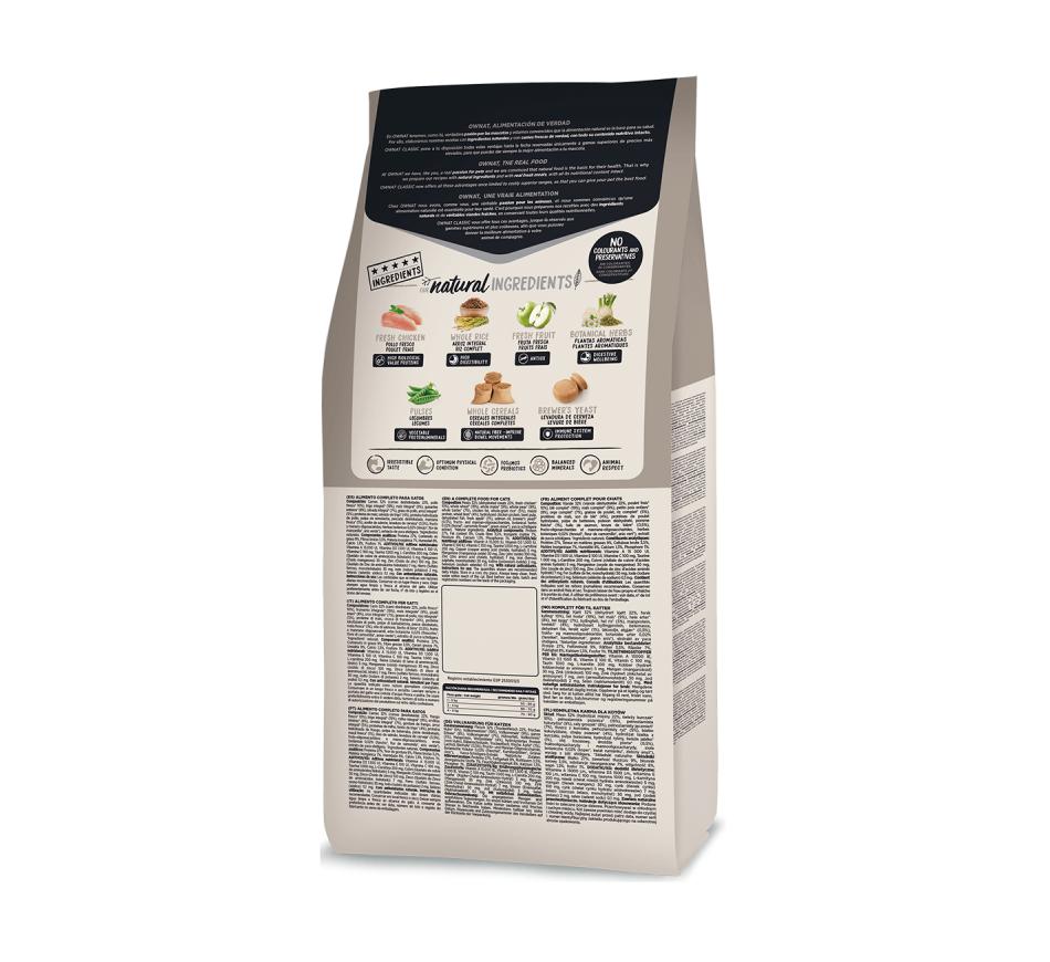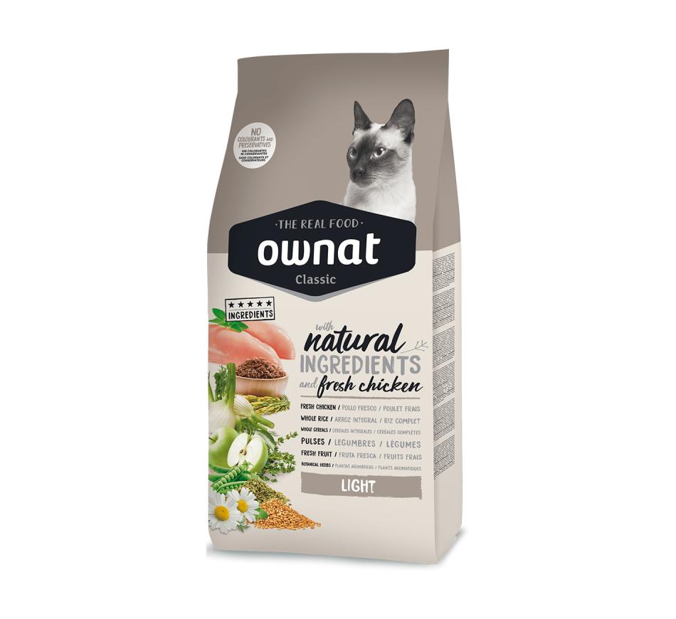 Ownat Classic Light Gato no utiliza conservantes ni colorantes. Su composición favorece una óptima condición física gracias al aporte equilibrado de proteínas y grasas. Tu salud está protegida con vitamina A, C, D, E y minerales, además de la taurina, elemento imprescindible para el buen funcionamiento del corazón de los gatos.