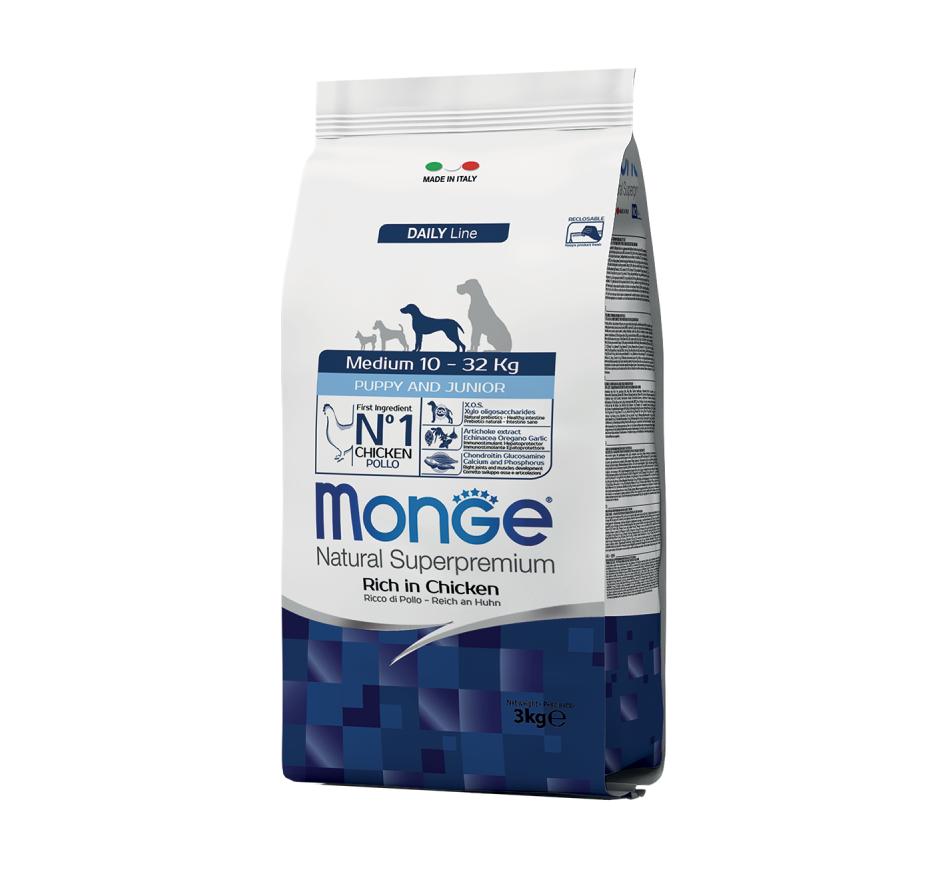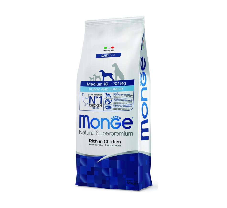 Monge Natural Superpremium Medium puppy & Junior es un alimento completo para cachorros de tamaño mediano (10-32 kg). Este alimento garantiza el bienestar de tu animal, gracias al alto nivel de nutrientes de calidad, cuyo ingrediente principal es el pollo y además está enriquecido con XOS (Xilo-oligosacáridos), prebióticos de última generación que mantienen el bienestar intestinal.